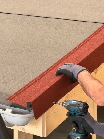 - Bringen Sie die Ortgangbleche auf beiden Seiten des Daches an. Verteilen Sie sie gleichmäßig bis zur Kreidelinie und schrauben Sie sie mit mindestens 2 Schrauben fest. Jede Windfeder ist mit einer neutralen Zone von bis zu 7,5 cm versehen. Dieser Raum wird genutzt, um eine proportionale Verteilung der Platten zu vereinheitlichen.