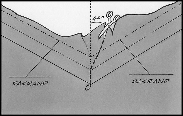 - Schneiden Sie dann die GUMMI-DACH-Folie unter einem Winkel von ca. 45° bis zur Dachoberfläche und schneiden Sie am Ende etwas zurück, sodass ein kleiner Kreis entsteht. Dies verhindert eventuelles Einreißen bei der manchmal zu heftigen Handhabung der GUMMI-DACH-Folie während der Verlegung.