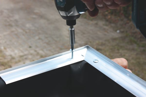 - Screw on the corner piece. Also pre-drill the roof edge profiles in the specified slot at the top every 40 cm, starting and ending 4 cm from the end or use Aquaplan SELF-Drilling Screws immediately. Fill the sealant gutter as described. Slide the eaves trim over the corner piece connection piece up to the protruding marking point in the middle of the connection piece. A small gap between the trim is necessary for the expansion and working of the eaves profile.