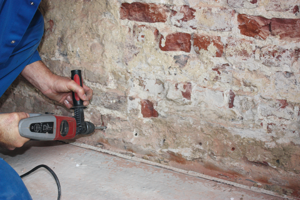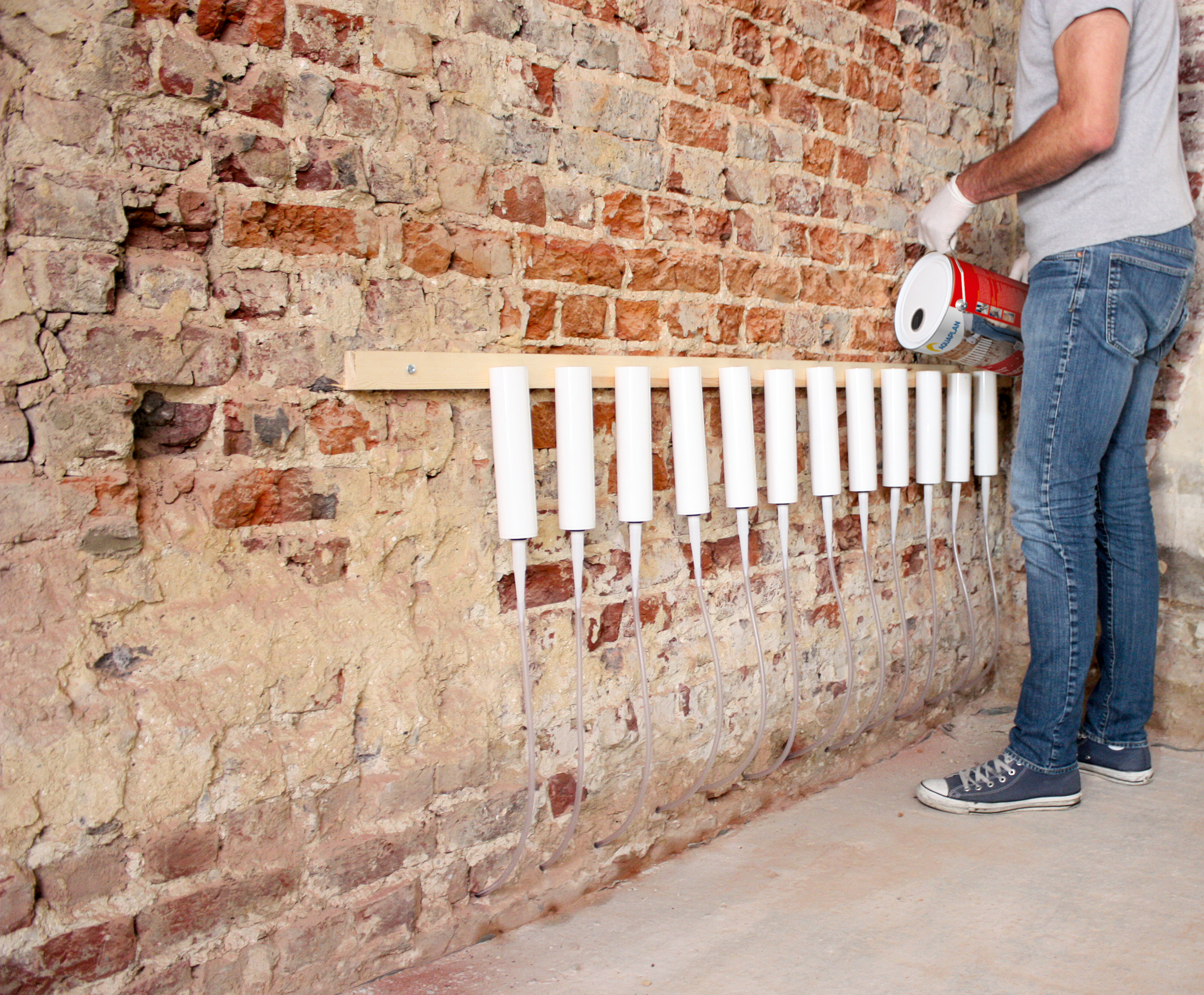 - Drill 10 mm diameter injection holes every 12 cm in a horizontal joint 5 to 7 cm above the floor at an angle of 10° to 15°. Drill to a depth of 4/5 of the wall thickness. Repeat the same procedure for walls thicker than 40 cm on the other side of the wall.