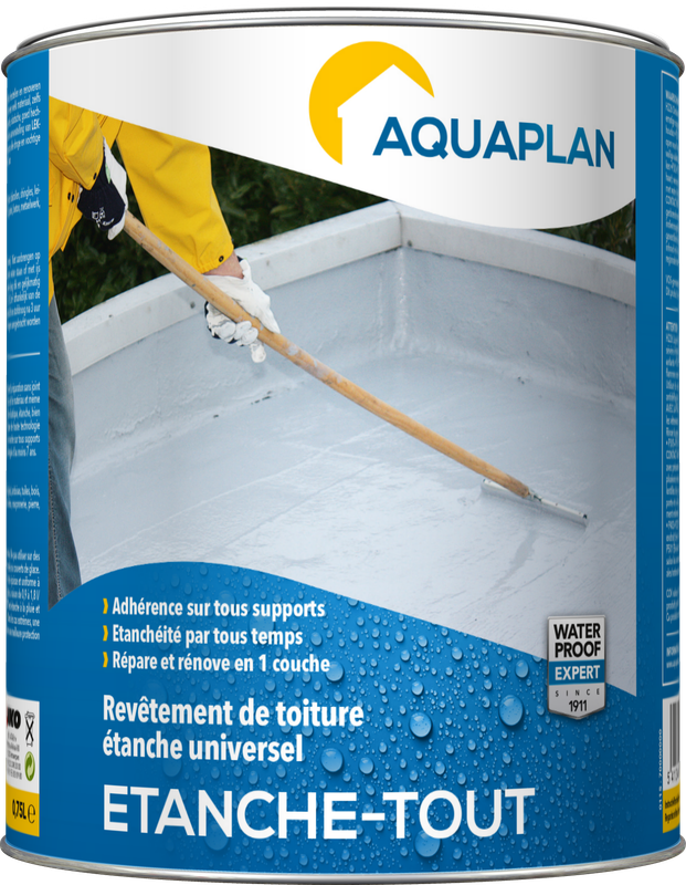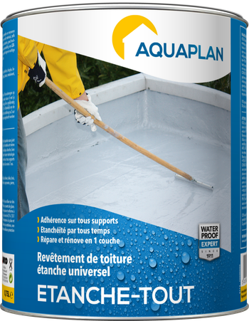 - Agitez bien ÉTANCHE-TOUT et appliquez une seule couche épaisse et uniforme avec la brosse, le rouleau ou la raclette à raison de 0,9 à 1,8 l//m². La consommation dépend du type de support et de la nature de la dégradation. ÉTANCHE-TOUT est étanche à la pluie et sec hors poussière après 3 h à 20°C.