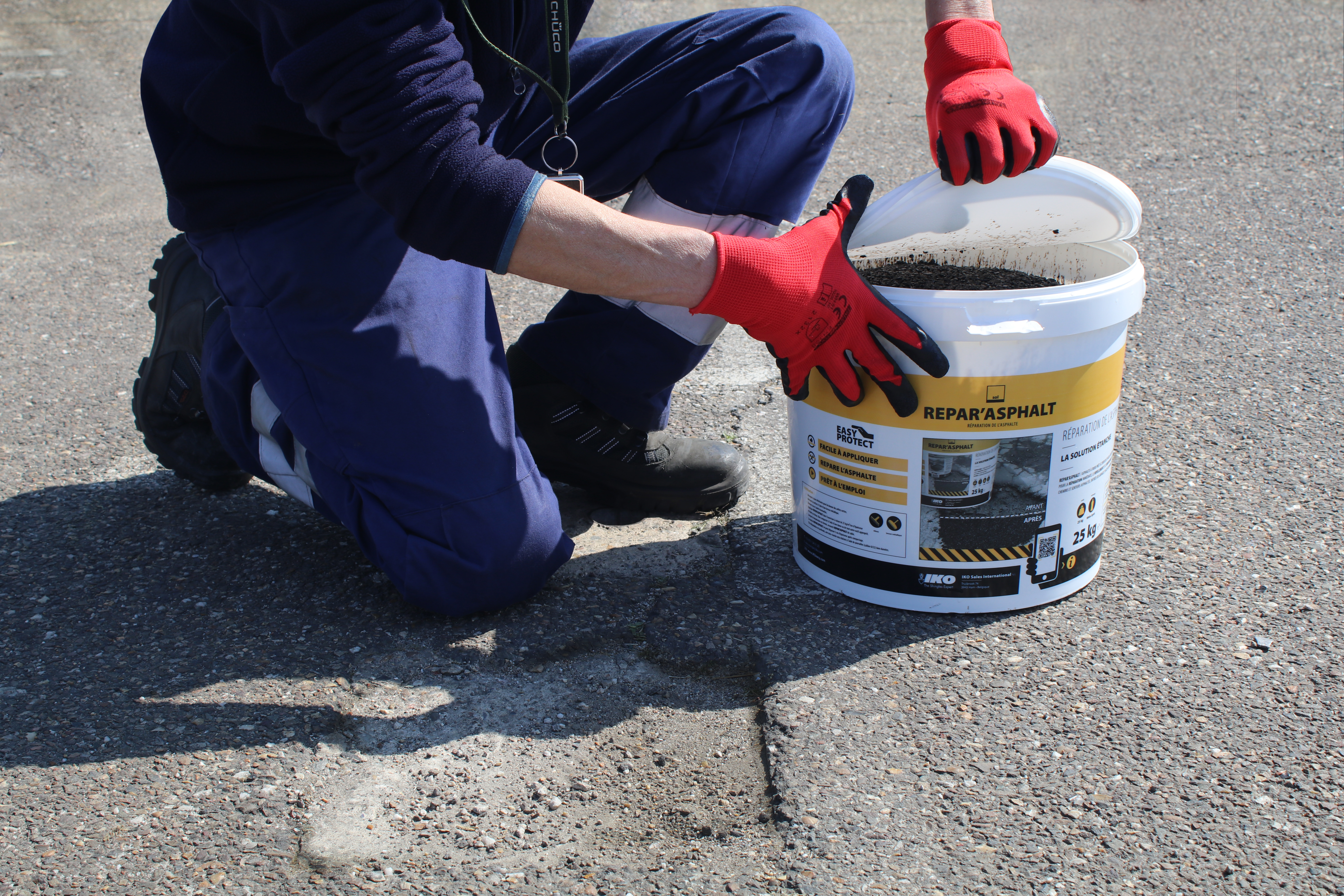 - Épandez Repar'Asphalt avec du sable aux hautes températures.