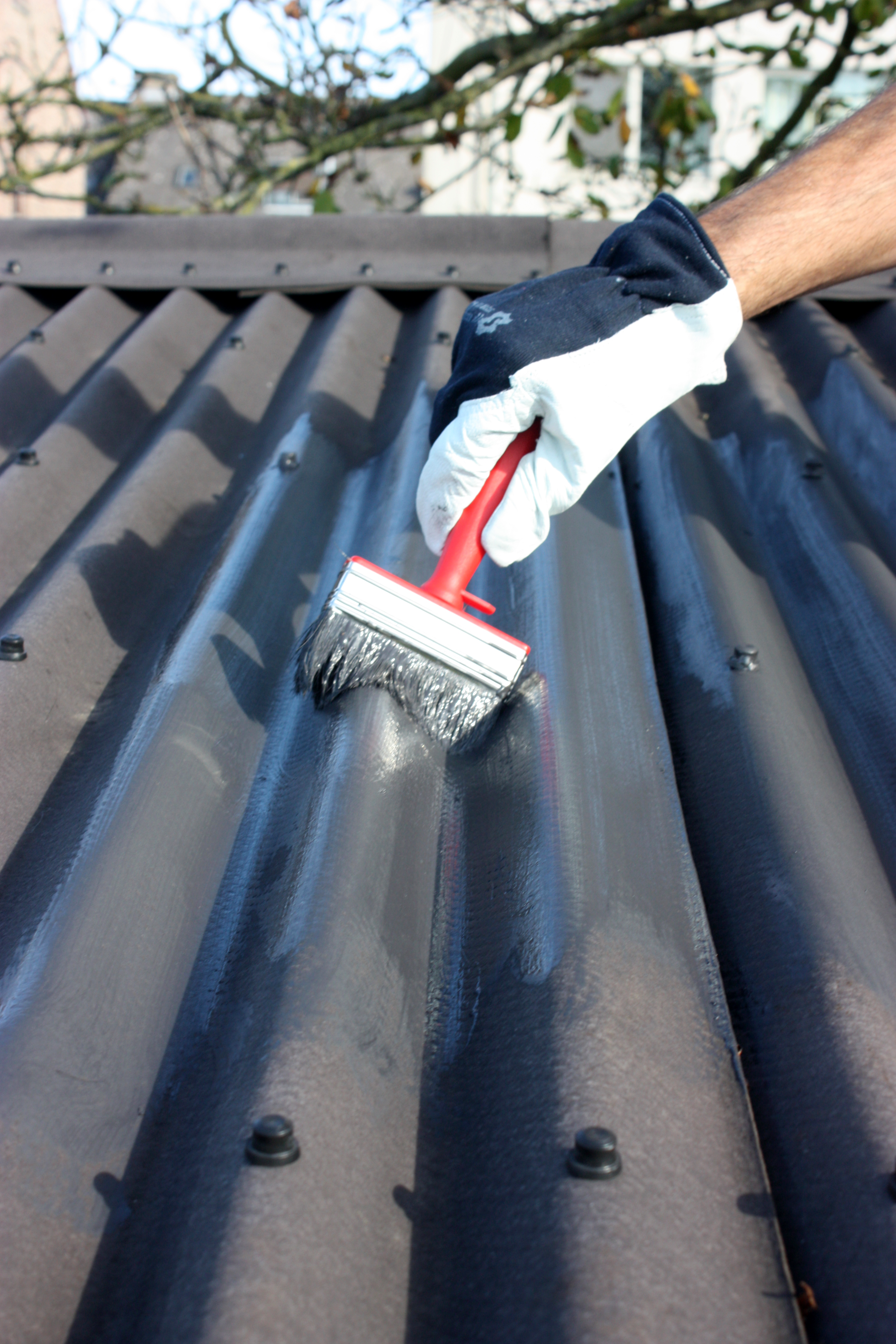 - Appliquez une première couche de Roofpaint dilué avec 10 à 15% d'eau avec la brosse ou le rouleau à raison de +/- 0,12 à 0,17 l/m²/couche et laissez sécher 4 h.