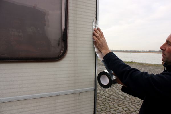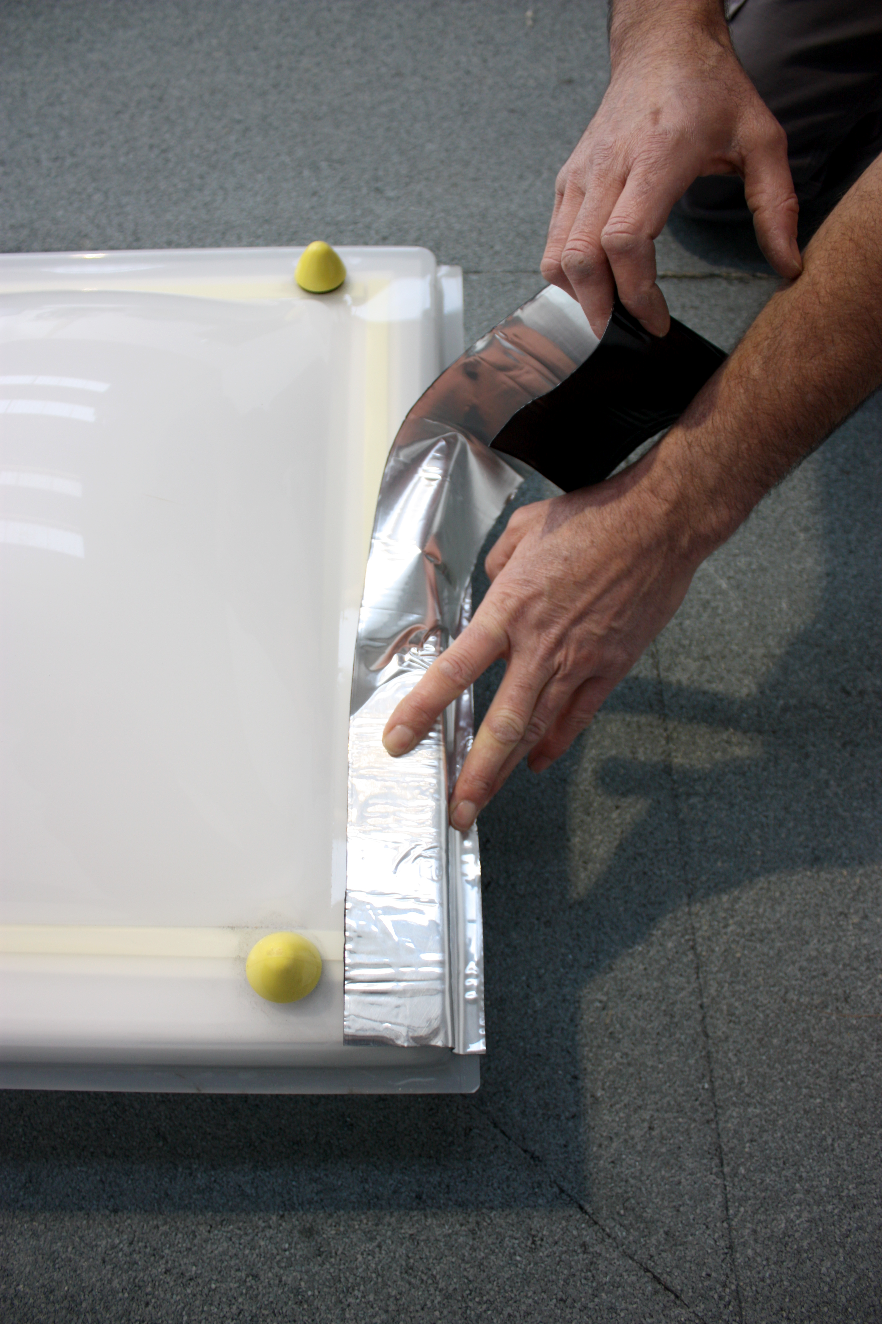 - Snij of knip AQUA-BAND op lengte, verwijder de beschermfolie en breng AQUA-BAND aan. Druk stevig aan zodat AQUA-BAND de vorm van de ondergrond aanneemt en strijk eventuele vouwen weg met een doek. Verwijder bij lange stroken de beschermfolie in delen van ca. 40 cm.