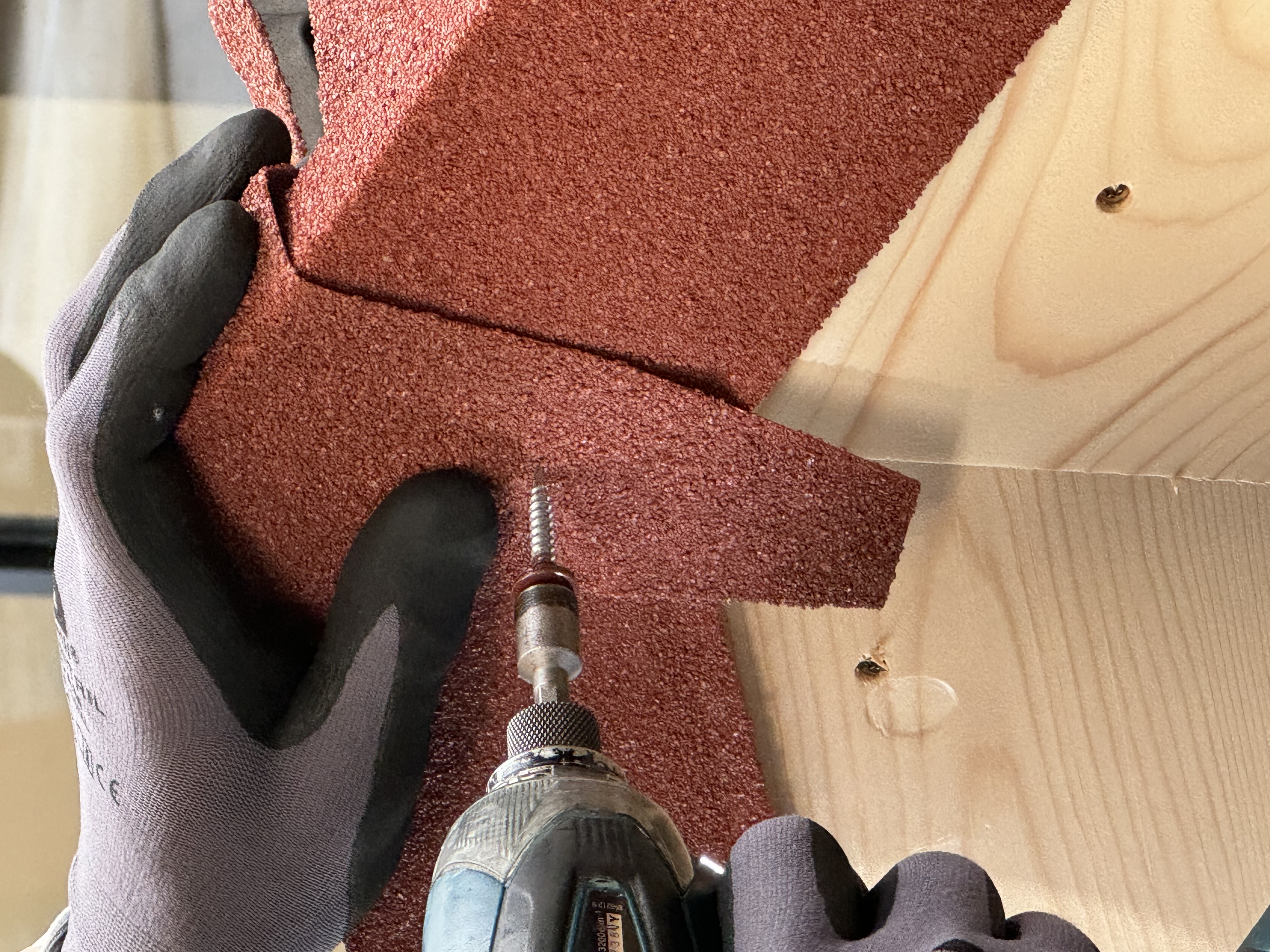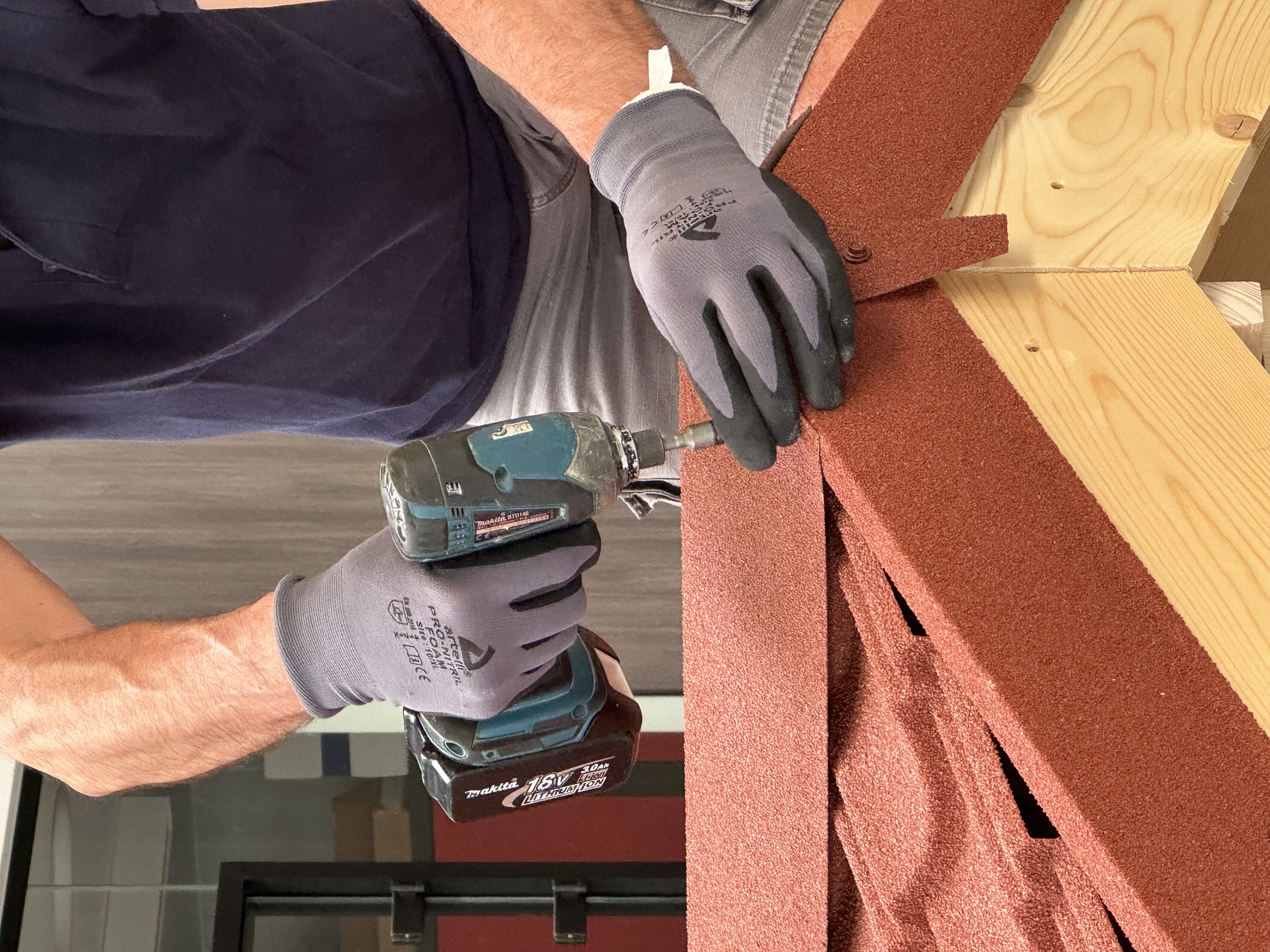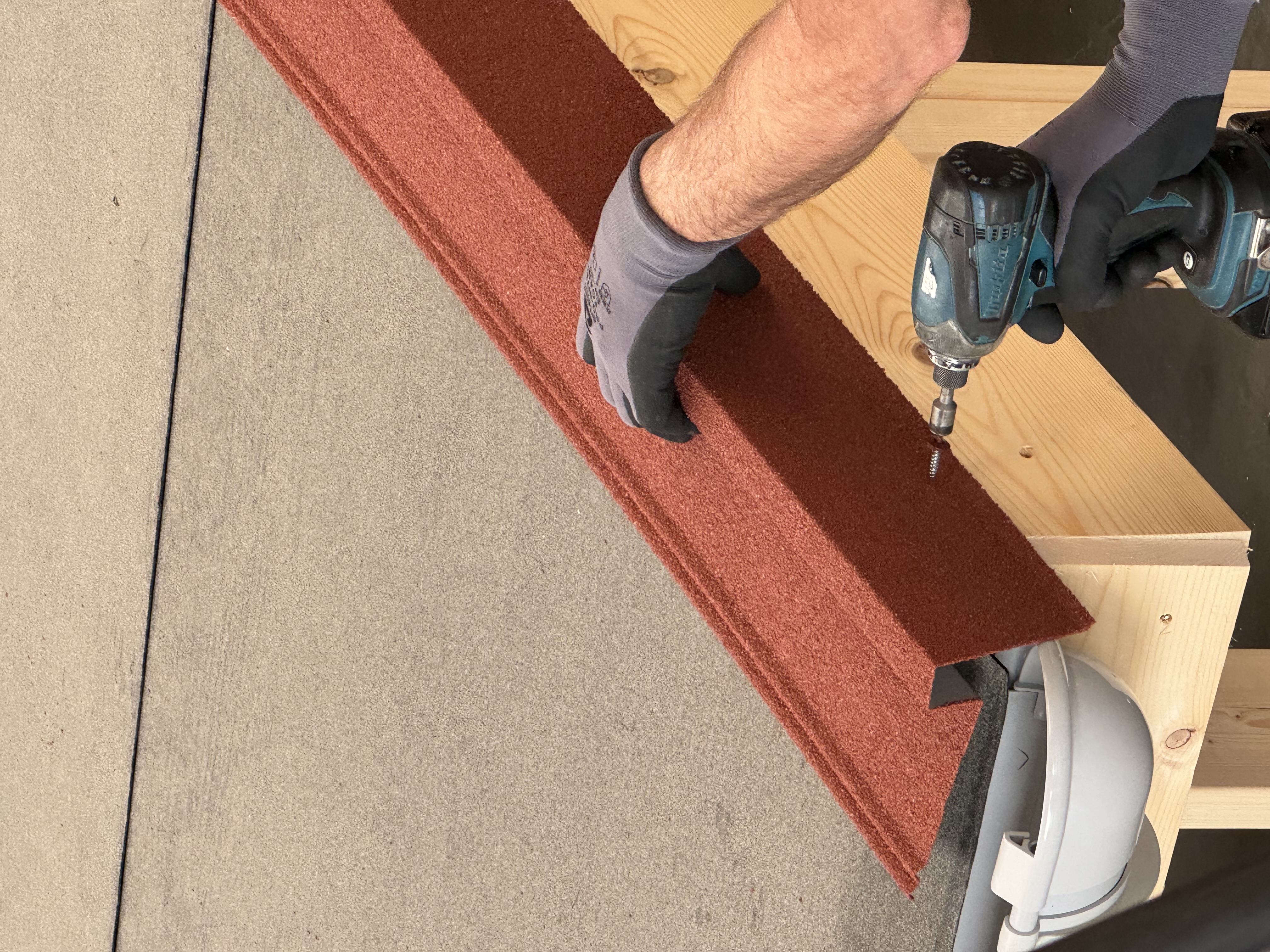 - Dicht vervolgens de uiteinden van de nok af door het afsluitstuk bovenop de windveren te bevestigen. Verdeel de nokken gelijkmatig over de hele lengte en schroef ze vast op de overlappingen, alsook de eerste en de laatste op de windveren.