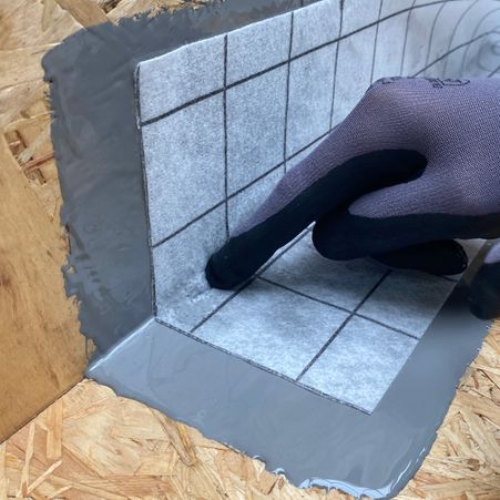- Dit doe je met de nat-in-nat methode: eerst een laag ROOF COAT LIQUID MEMBRANE aanbrengen op de plek van het polyestervlies.